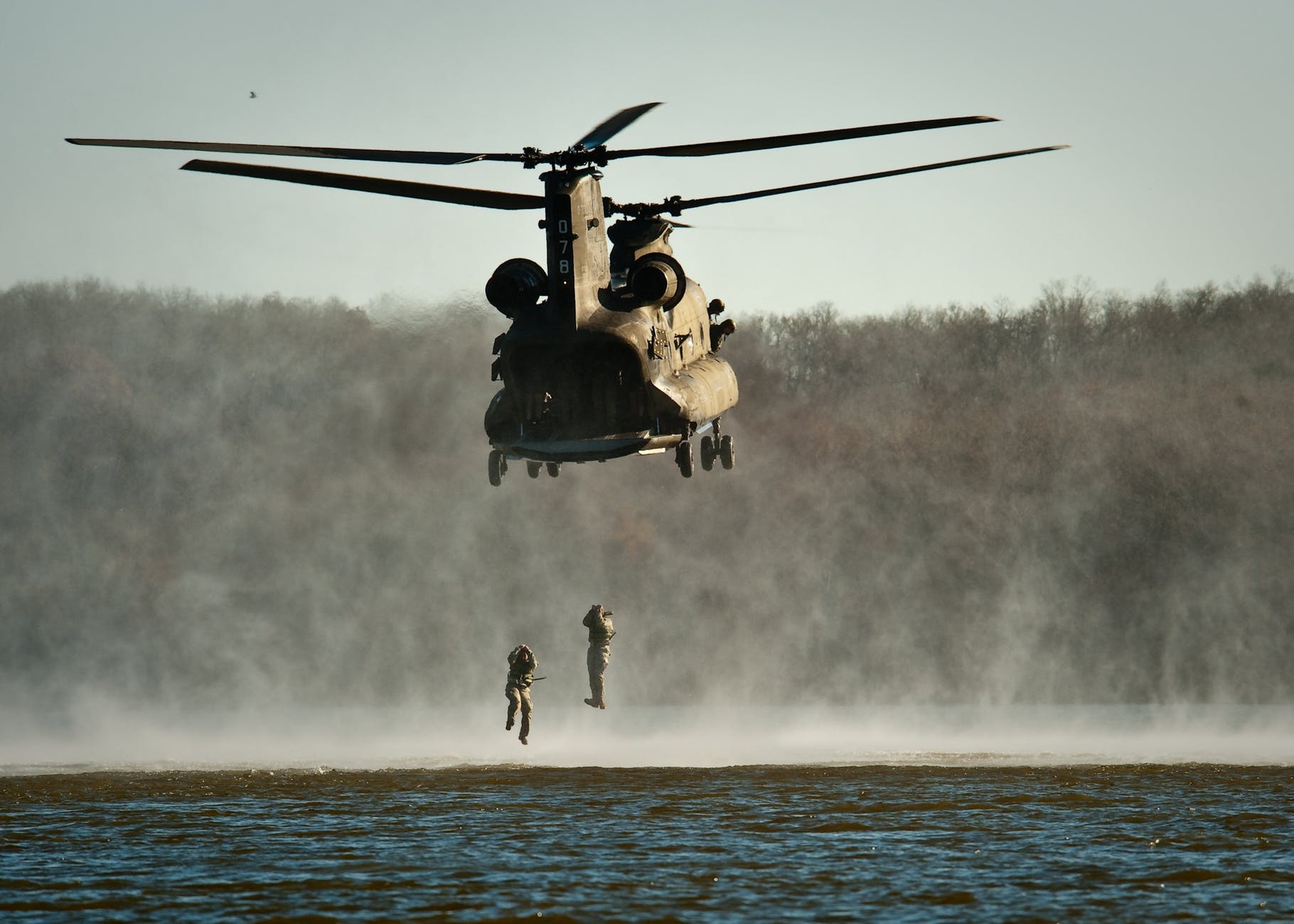 gray helicopter above body of water